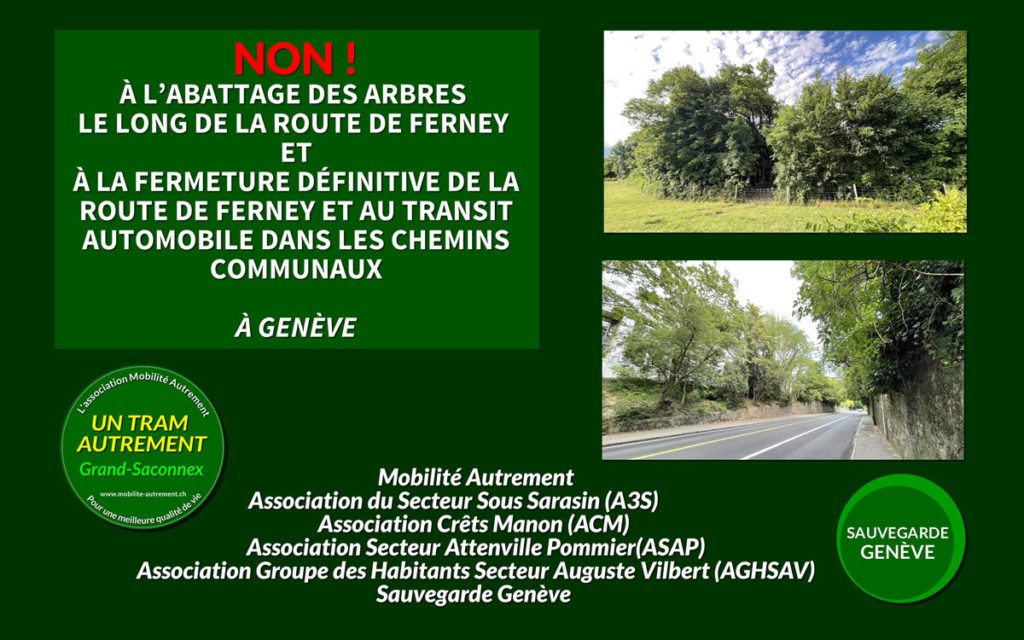 La fermeture définitive de la route de Ferney entre la route des Morillons et l’Hôtel Intercontinental fait partie de l’infrastructure liée au futur Tram Nation Grand- Saconnex. Elle aura pour conséquence de déverser 16’600 véhicules en transit dans les chemins communaux du Grand-Saconnex, de la Ville de Genève, de Pregny-Chambésy, de Meyrin et de Vernier. De plus, l’abattage de l’aire boisée du Chapeau-du-Curé et le long de la route de Ferney induirait un important îlot de chaleur en contradiction avec les objectifs de lutte contre le réchauffement climatique.
